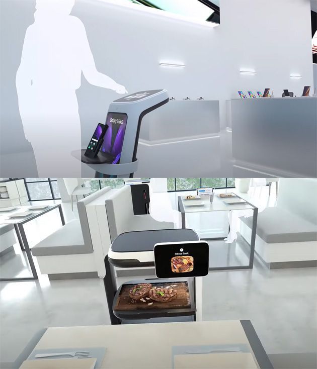 Samsung ha anche mostrato anche l’esempio di "robot cameriere", capace di mostrare al commensale al tavolo il menu su uno schermo touch per fare l’ordine, e di "robot commesso", che può accogliere il cliente all’ingresso di un negozio e mostrargli un catalogo di prodotti prima di portarlo nel punto del negozio in cui poter trovare il prodotto desiderato.