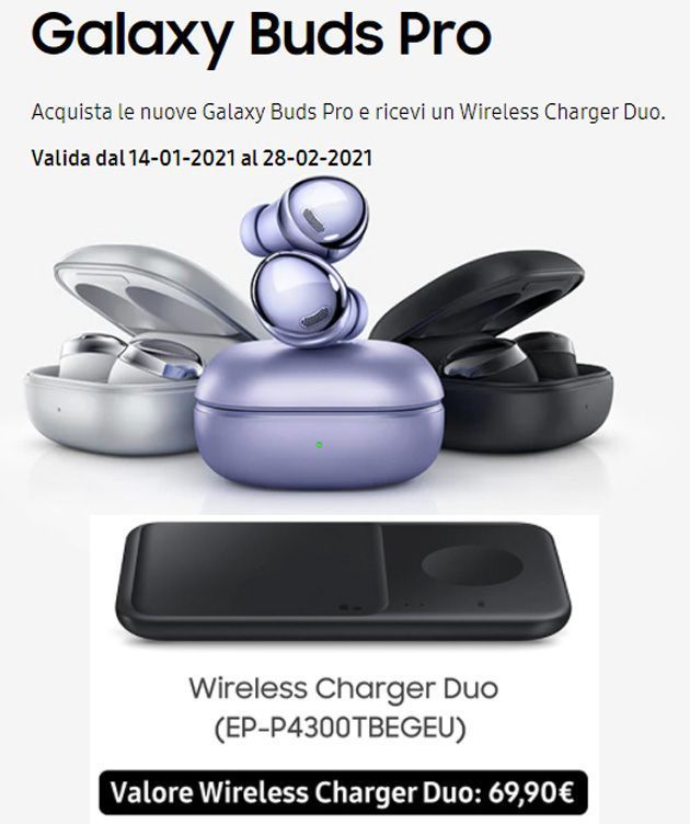 Chi acuqista Galaxy Buds Pro tra il 14 gennaio e il 28 febbraio 2021 inclusi, e registra il prodotto entro il 10 marzo 2021 su members.samsung.it/GalaxyBudspro, può ricevere in regalo un Wireless Charger Duo Samsung (codice prodotto EP-P4300TBEGEU) del valore commerciale di 69,90 euro. QUI maggiori informazioni.
