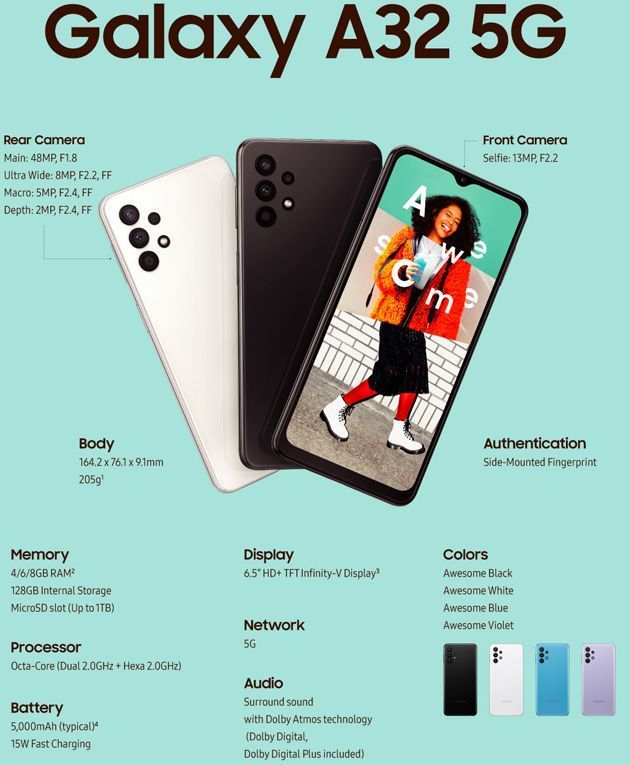 Qui sotto è disponibile l’infografica ufficiale con riepilogate tutte le caratteristiche principali del Samsung Galaxy A32 5G.