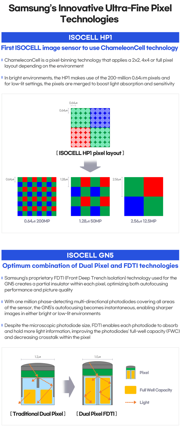 Samsung Electronics ha presentato ISOCELL HP1, un sensore di immagine da 200 megapixel (MP) con pixel da 0,64um, e ISOCELL GN5, un sensore di immagine con tecnologia Dual Pixel Pro con messa a fuoco in tutte le direzioni con due fotodiodi in un singolo pixel da 1.0um.