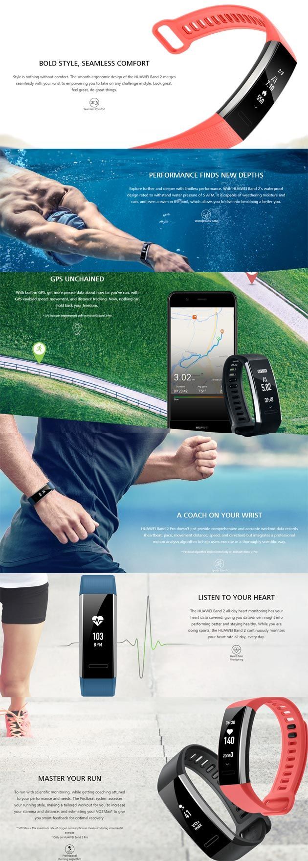 Con il GPS integrato, solo in Huawei Band 2 Pro, è possibile ottenere dati più precisi sull’attività fisica grazie al monitoraggio della posizione, degli spostamenti, della velocità e delle distanze percorse. Huawei Band 2 Pro non solo fornisce lo storico egli allenamenti con statistiche complete e precise (battito cardiaco, passo, distanza di movimento, velocità e direzione), ma integra un algoritmo di analisi di movimento professionale per aiutare ad esercitarsi "in modo scientifico", secondo Huawei, attraverso un personale "coach" che si adatta alle prestazioni e alle esigenze dell’utente, disponibile tramite l’app Huawei Benessere. Il sistema Firstbeat valuta lo stile di esecuzione dello sport, consigliando un allenamento su misura per aumentare la resistenza distanza e stimando la massima quantità di ossigeno che il proprio corpo può consumare in un minuto (VO2max). Infatti, con la versione Pro di Huawei Band 2 è possibile tracciare il proprio VO2 Max, un parametro biologico che esprime il volume massimo di ossigeno che un essere umano può consumare nell’unità di tempo per contrazione muscolare. Secondo Huawei , la tecnologia consente di misurare il VO2 con una precisione pari a circa il 95%.