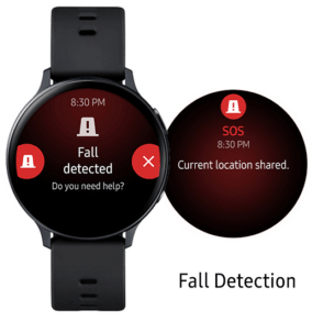 Sul Samsung Galaxy Watch Active2 viene aggiunta la funzione chiamata ‘Rilevamento cadute‘ che, quando attiva, nel momento in cui l’orologio rileva una potenziale caduta mostra sul quadrante una notifica che offre la possibilità di inviare una notifica SOS ad un massimo di quattro contatti pre-stabiliti, in modo da ricevere immediato soccorso.