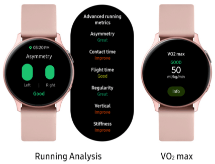 Per migliorare le proprie prestazioni atletiche, la propria forma fisica e cercare di prevenire gli infortuni, debutta sul Samsung Galaxy Watch Active2 la funzione "Analisi Avanzata della corsa" ("Running Analysis"). Con questa, lo smartwatch offre un’analisi della corsa con una varietà di nuove metriche dettagliate (come asimmetria, regolarità, rigidità, oscillazione verticale, tempo di contatto con il suolo) utili a migliorare le prestazioni e a ridurre gli infortuni nel tempo. Inoltre, diventa possibile misurare il VO2 max, un indicatore della quantità massima di ossigeno che una persona può utilizzare durante un esercizio ad alta intensità. È una misurazione comune utilizzata per determinare la forma fisica e la capacità di prestazione di un atleta, che può monitorare i progressi negli allenamenti quotidiani e aiutare a migliorare la propria resistenza fisica.