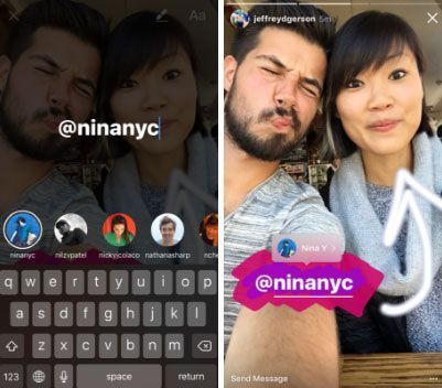 Oltre alla nuova modalità di Boomerang, Instagram ha anche aggiunto le menzioni nelle storie, quindi è possibile citare altri utenti all’interno delle storie. La citazione funziona come se si stesse taggando qualcuno in un commento o una didascalia, quindi basta usare il simbolo @ seguito dal nome utente. All’interno della storia il nome di chi è stato citato viene mostrato con una sottolineatura e toccando il nome utente si apre una finestra pop up che mostra un’anteprima del profilo della persona.