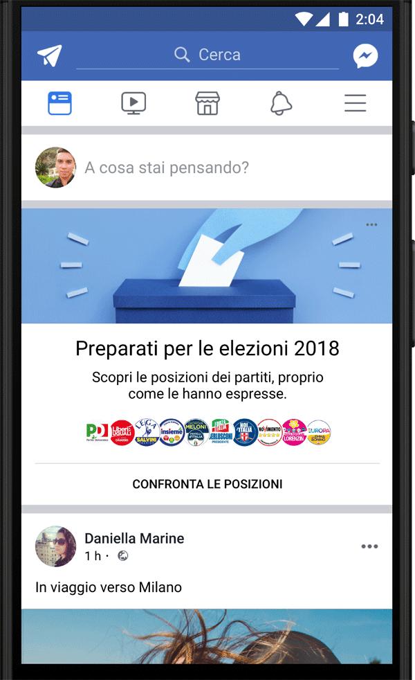 Cosa devono aspettarsi quindi di vedere su Facebook gli utenti italiani? In vista delle elezioni politiche italiane in programma il 4 marzo 2018, gli italiani presenti su Facebook possono vedere lo strumento “Punti di vista” all’interno del proprio feed di notizie che è stato sviluppato con lo scopo di mettere a confronto le posizioni dei principali partiti politici su questioni importanti e vedere una serie di punti di vista diversi.