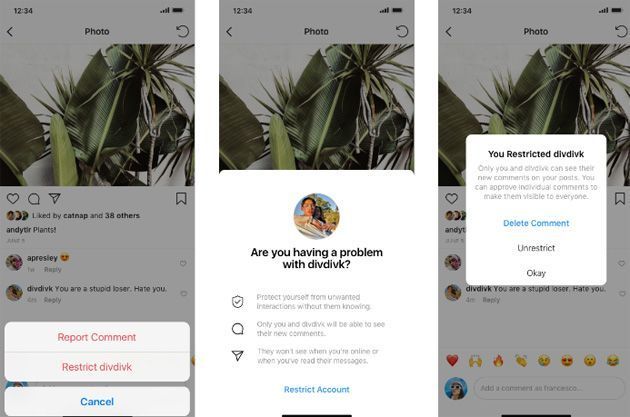 Anche se identificare e rimuovere il bullismo su Instagram è importante, secondo Mosseri c’è anche bisogno di permettere alla community di difendersi da questo tipo di comportamento. La società ha detto che giovani utenti di Instagram hanno ammesso di essere riluttanti a bloccare, smettere di seguire o segnalare il loro prepotente perché potrebbe aggravare la situazione, specialmente se hanno a che fare con questa persona anche nella vita reale. Instagram ha quindi pensato di creare una funzione che consenta alle persone di controllare la propria esperienza su Instagram senza informare la persona che vogliono evitare che la stanno evitando. Prossimamente, Instagram inizierà a testare ‘Restrict’, un nuovo modo attraverso cui gli obiettivi di bulli potranno proteggere il proprio account. Funziona cosi: dopo aver limitato qualcuno, i commenti sui propri post della persona ‘limitata’ saranno visibili solo a quella persona. Gli utenti potranno anche scegliere di rendere visibili i commenti di una persona con restrizioni agli altri solo dopo averli approvati. Inoltre, le persone con restrizioni non saranno in grado di vedere quando la persona che le ha limitate è attiva su Instagram o quando ha letto i loro messaggi diretti.