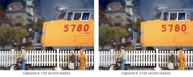 Oltre alla cattura di video a 1080p a 1,000fps la RAM on-chip può anche servire per migliorare la qualità delle foto, memorizzabili RAM in appena 1/120 di secondo alla risoluzione di 19.3MP (prendendo come esempio questo sensore). Ottimo risultato se si considera che il collegamento tra la fotocamera e il chipset del telefono è molto piu’ lento, impiegando solitamente 1/30 di secondo alla stessa risoluzione. Il collegamento con il chip del telefono di fatto non viene velocizzato, ma una volta che i dati sono salvati nella RAM quando impigano per essere trasferiti al chipset dello smartphone conta poco. La qualità migliora anche perchè viene ridotto l’intervallo di tempo per la lettura di ogni linea di pixel. Questa tecnologia riduce al minimo la distorsione focale che nelle immagini tende a verificarsi quando si riprendono soggetti in movimento con uno smartphone, tipo di dispositivo a cui manca un otturatore meccanico per il controllo del tempo di esposizione di soggetti in rapido movimento.