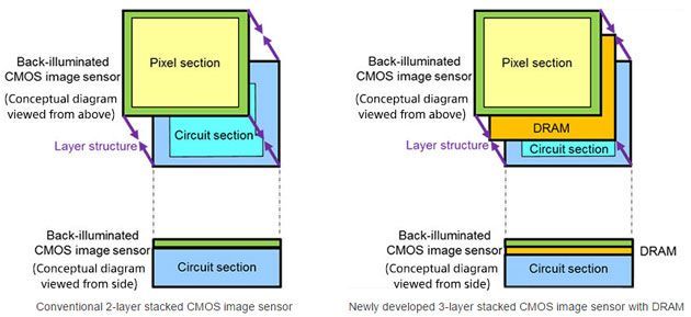 Il nuovo sensore di immagine è costituito da uno strato DRAM aggiunto al sensore di immagine CMOS convenzionale a 2 strati impilati, interposto tra lo strato di pixel retroilluminato e il chip con i circuiti per l’elaborazione del segnale. Grazie e questo schema, tale sensore di nuova concezione con DRAM offre una rapida velocità di lettura dei dati, il che rende possibile catturare immagini fisse di soggetti in rapido movimento con la minima distorsione focale, nonché film con movimento in super slow motion fino a 1.000 fotogrammi al secondo (circa 8x più veloce dei prodotti convenzionali) in risoluzione full HD (1920×1080 pixel).
