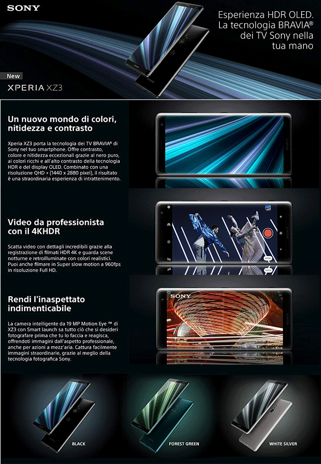 Sony Xperia XZ3 è un telefono da 6 pollici con un display 18:9 QHD+ HDR con design senza bordi curvo che utilizza display OLED con tecnologia Bravia, racchiuso in una nuova struttura in alluminio. E’ presente la tecnologia Advanced X-Reality con conversione HDR per ottenere tutti i video SDR vicino alla qualità dell’HDR. La fotocamera intelligente Motion Eye è da 19 megapixel con acquisizione predittiva e registrazione di video in 4K HDR per più contrasto, colore e dettaglio oltre alla possibilità di registrare video in super slow motion in Full HD. La fotocamera frontale è da 13 MP con nuovo obiettivo più luminoso e modalità effetto bokeh. Xperia XZ3 monta potenti altoparlanti stereo anteriori con surround S-Force e il sistema di vibrazione dinamica di Sony (il telefono vibra al ritmo del suono). Ad alimentare lo smartphone si trovano l’ultimo processore Qualcomm Snapdragon 845 octa-core e il sistema operativo Android 9 Pie. Lo smartphone Xperia XZ3 di Sony offre anche resistenza all’acqua con la certificazione IP68, sensore di impronte digitali e una grande batteria da 3300mAh con apprendimento intelligente e carica wireless.