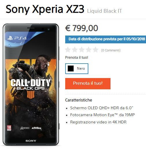 Sony Xperia XZ3 in preordine regala Call of Duty Black Ops 4 per PS4