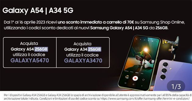 Samsung Galaxy A34 5G e Galaxy A54 5G 256GB scontati 70 euro sul Samsung Shop Online