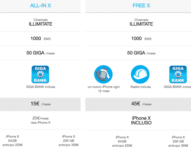 – FREE è disponibile per Abbonamento e Ricaricabile nella versione speciale FREE X con minuti illimitati, 1000 sms e 50 Giga di Internet al prezzo di 45 euro al mese con anticipo di 229 euro per iPhone X da 64GB o di 399 euro per iPhone X da 256GB. FREE X consente di cambiare iPhone X dopo 12 mesi, include Kasko e GIGA BANK (i Giga non consumati si possono usare il mese successivo).