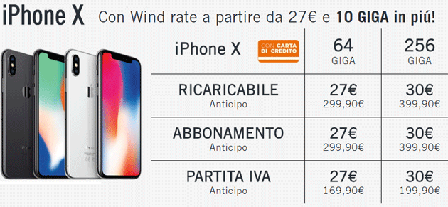 – iPhone X 64GB: 27 euro/rinnovo + 169,90 euro di anticipo