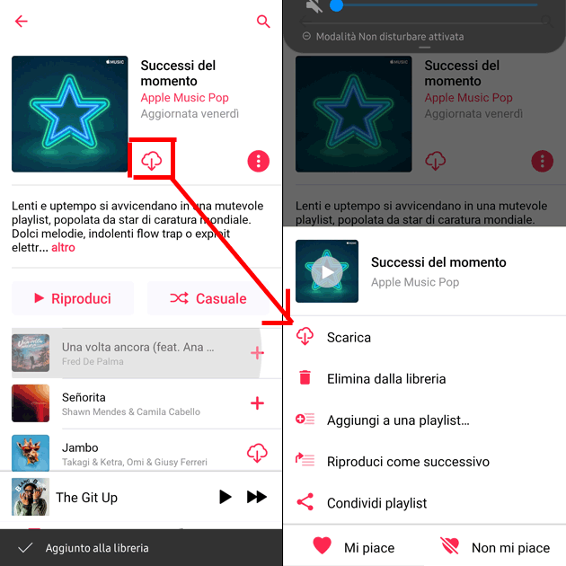 Nel caso sia presente il pulsante "…" (chiamato "Più Opzioni"), si puo’ fare tap su di esso e scegliere l’opzione "Scarica". Il tasto si trova sulla destra del nome del brano, dell’album o della playlist selezionata. Anche in questo caso, ‘scarica’ puo’ essere presente solo dopo aver aggiunto il brano/album/playlist alla propria libreria. In un attimo inizierà il download della canzone o della playlist, così da poterla ascoltare in totale libertà, senza dover dipendere dalla connessione ad Internet. Ovviamente tutti questi contenuti sono disponibili in modalità offline fino allo scadere dell’abbonamento ad Apple Music. Non appena la membership non sarà più attiva, i brani verranno cancellati automaticamente.