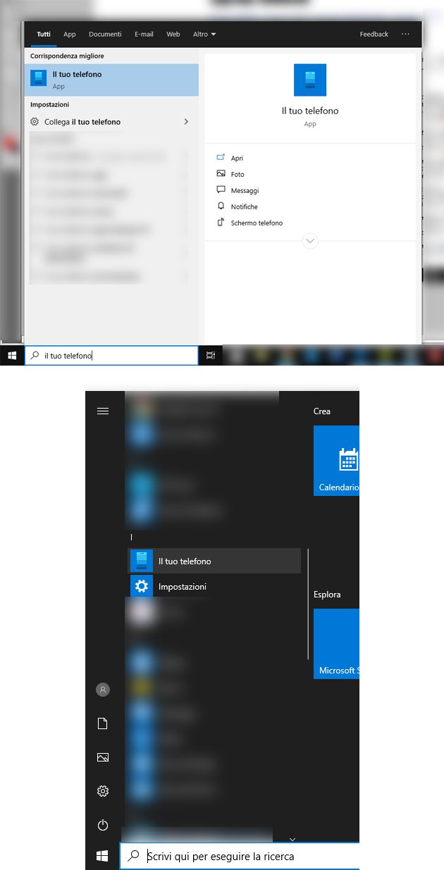 Prima di poter iniziare ad effettuare il mirroring dello schermo del proprio smartphone sul PC bisogna associare il dispositivo mobile al computer. E’ molto semplice. Infatti, l’app Il tuo telefono è preinstallata su PC con Aggiornamento di Windows 10 (ottobre 2018), quindi si puo’ iniziare digitando, sul PC, nella casella di ricerca sulla barra delle applicazioni ‘Il tuo telefono’ e selezionare l’app ‘Il tuo telefono’ nei risultati.