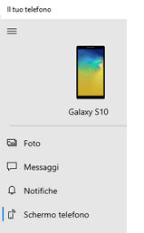 Partiamo prima con lo spiegare che cosa è l’applicazione ‘Il tuo telefono’ per WIndows 10, anche se in breve perchè ne abbiamo già ampiamente parlato QUI. L’app Il tuo telefono consente di connettere il PC al proprio smartphone Android (se compatibile) tramite l’app "Complemento de Il tuo telefono" per la maggior parte dei telefoni Android o l’app "Collegamento a Windows" nei telefoni Samsung selezionati (al momento serie Note10 e S10) per poter leggere e rispondere agli SMS con facilità, visualizzare le foto recenti dal telefono, e gestire le notifiche del telefono direttamente dal PC. Al momento, solo sui telefoni Samsung Galaxy Note10 e S10 è disponibile anche la funzione "Schermo telefono", accessibile dalla scheda con lo stesso nome che compare sulla sinistra dell’app Il Tuo Telefono su PC sotto ‘Foto’, ‘Messaggi’, ‘Notifiche’ – sui dispositivi non compatibili la sheda ‘Schermo telefono’ è nascosta nell’app Il Tuo Telefono.
