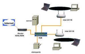 In questo scenario sia la stampante che il server sono collegati tramite filo al nostro HUB, tutti i pc connessi in rete sono in grado di reindirizzare le stampe, di ricevere/inviare Email , di utilizzare risorse residenti sul server il quale naturalmente deve avere installato un sistema operativo in grado di gestire queste risorse, per esempio Windows 2000 server, Linux , ecc.