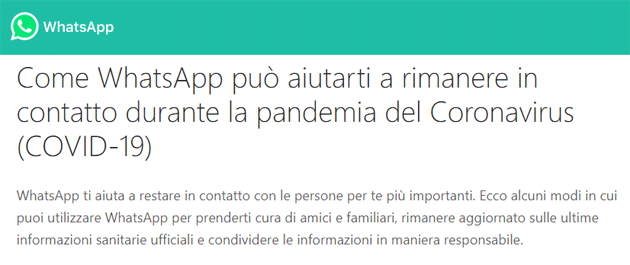 WhatsApp per la pandemia Coronavirus COVID-19 lancia Hub Informativo e dona 1 milione di dollari