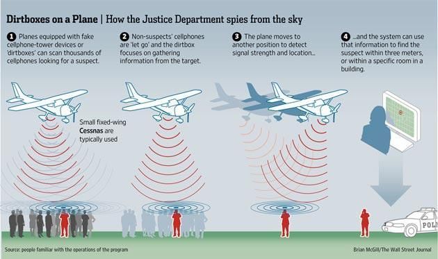 La prossima volta che si utilizza il cellulare in mezzo ad una folla, almeno se ci si trova negli Stati Uniti, è bene ricordarsi che i Marshals degli Stati Uniti possono essere in ascolto… Come? Attraverso dispositivi speciali apposti sugli aerei che vola in cielo, secondo un rapporto del The Wall Street Journal. Si tratterebbe di finte torri di comunicazioni posizionate sugli aerei, progettate per intercettare le comunicazioni dei telefoni cellulari ed ogni altro tipo di informazione che viaggia nel loro raggio di azione. Gli americani innocenti hanno le stesse probabilità che le loro informazioni vengano raccolte come chiunque altro.