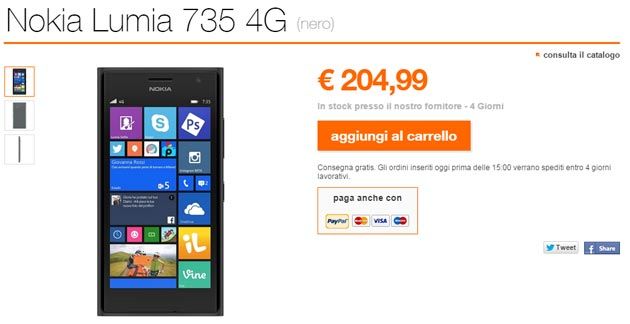 Orange propone lo smartphone Nokia Lumia 735 4G al prezzo di 204,99 euro per tutti e a 194,99 per i nuovi clienti che utilizzano il buono di cui sopra. Il Lumia 735 è uno smartphone pensato per chi ama farsi i selfy grazie alla sua fotocamera frontale da 5 megapixel con obiettivo grandangolare e apertura f/2.4, che non solo permette di catturare immagini nitide e vivaci, ma anche di includere nello scatto uno sfondo più ampio rispetto ad una fotocamera normale.
