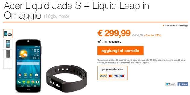 Altra proposta di Orange è il pacchetto che comprende lo smartphone Acer Liquid Jade S abbinato allo smartwach Liquid Leap, venduti insieme al prezzo di 299,99 euro invece di 399,98 euro (Sconto: 25%).