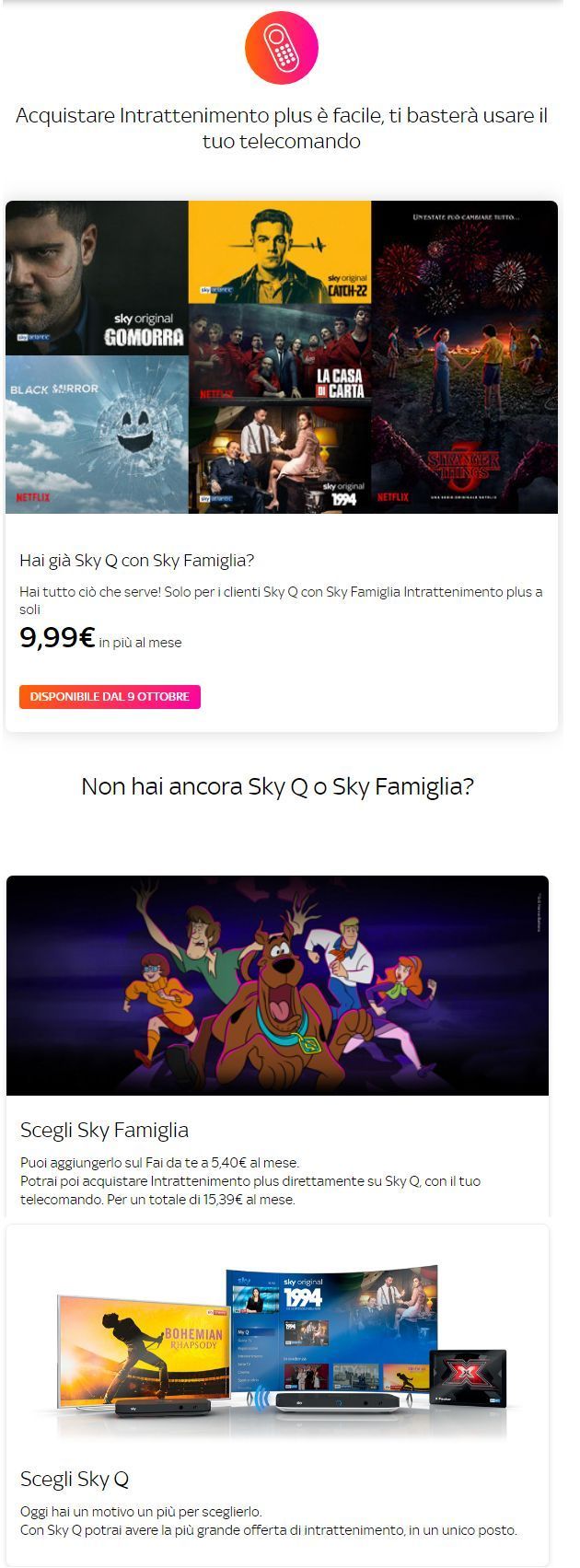 Dal 9 Ottobre 2019, un cliente Sky Q con Sky Famiglia puo’ acquistare Intrattenimento plus direttamente su Sky Q, tramite il telecomando e il PIN per completare l’acquisto (chi non ricorda il PIN puo’ accedere al Fai da te, entrare nella sezione “Gestisci dati e servizi” e selezionare “Reset e invio PIN” per ricevere il codice via e-mail). Un cliente Sky Q che non ha Sky Famiglia puo’ aggiungere questo pacchetto su Fai da te, poi acquistare Intrattenimento Plus su Sky Q. Chi non ha Sky Q ma il My Sky HD deve prima passare a Sky Q.