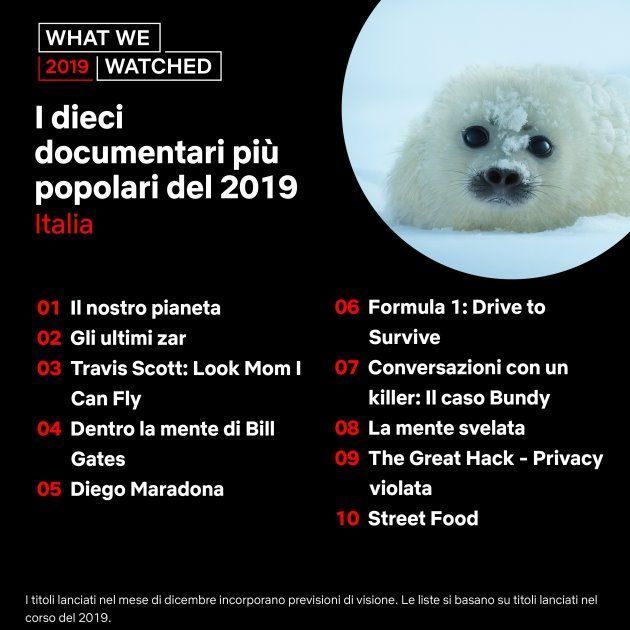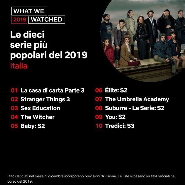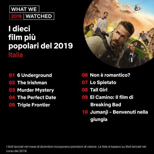 Da notare che i titoli lanciati nel mese di dicembre incorporano ‘previsioni di visione’, quindi non fanno riferimento a visualizzazioni che effettivamente gli abbonati a Netflix hanno fatto. Inoltre, le liste si basano solo su titoli lanciati nel corso del 2019, non in anni precedenti. In altre parole, anche se un titolo uscito nel mese di dicembre rientra in una certa posizione in classifica, è solo una previsione fatta da Netflix e non basata su visualizzazioni reali.