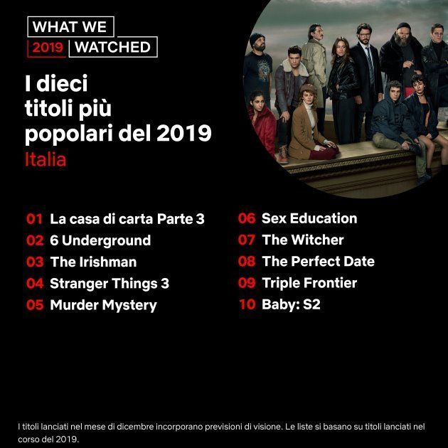 Nelle classifiche, come vedremo, spiccano i titoli originali Netflix. In Italia tra i contenuti piu’ popolari degni di nota ci sono la La casa di carta Parte 3, Sex EducationStranger Things 36 Underground e The Irishman. Negli Stati uniti, invece: Murder Mystery, 6 Underground, The Irisman, Triple Frontier, Strange Things 3, The Witcher e The Umbrella Academy.