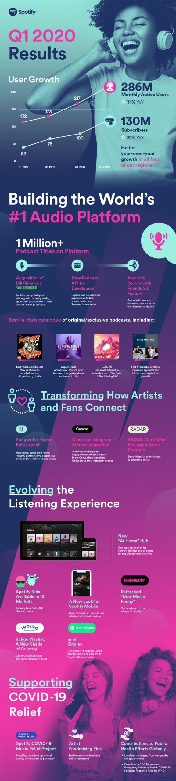 Per gli utenti, nei primi tre mesi del 2020, Spotify ha reso disponibile Spotify Kids in più mercati (non ancora in Italia), ha aggiornato l’interfaccia utente delle sue app mobile per iOS e Android includendo una nuova icona per la riproduzione casuale, una nuova posizione per i pulsanti ‘mi piace’, ‘altro’ e ‘scarica’, e la copertina del brano mostrata accanto al titolo. Spotify ha anche migliorato l’algoritmo che aggiorna ogni venerdì la playlist "New Music Friday" e altro ancora.