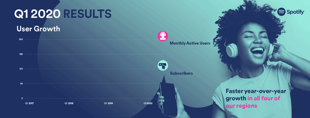 Il rapporto del primo trimestre del 2020 di Spotify, pubblicato il 29 aprile 2020, ha rivelato che il servizio di streaming musicale piu’ popolare al mondo puo’ contare, a fine marzo 2020, su 130 milioni di utenti Premium, ossia di utenti abbonati che pagano per avere accesso a tutte le funzionalità che offre. 6 milioni di abbonati si sono aggiunti nel corso dei mesi gennaio-febbraio-marzo 2020, in quanto il rapporto relativo al quarto trimestre del 2019 aveva riportato quota 124 milioni di abbonati. Questi su un totale di 286 milioni di utenti attivi mensilmente nel primo trimestre del 2020, quindi con circa 156 milioni di utenti che usano la versione gratuita del servizio, supportata dalla pubblicità. Erano 271 milioni gli utenti attivi mensili di Spotify a livello globale a fine 2019, quindi 15 milioni di utenti si sono aggiunti nei primi tre mesi del 2020.