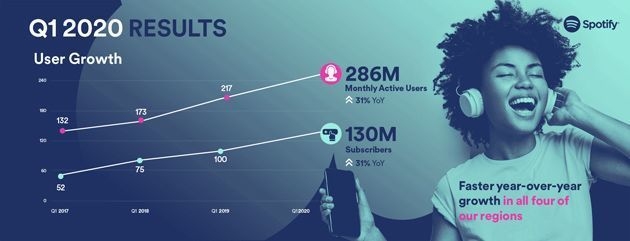 Nei primi tre mesi del 2020, Spotify ha aggiunto altri 6 milioni di abbonati per un totale di 130 milioni; 286 milioni sono gli utenti attivi mensilmente.