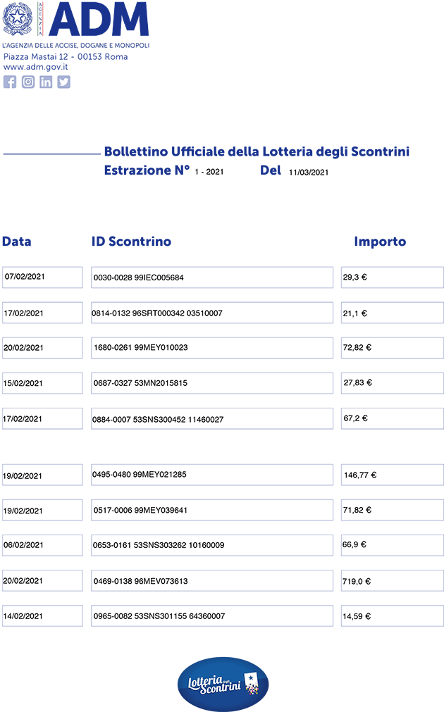 L’elenco dei vincitori dell’estrazione dell’11 marzo 2021 si può trovare nel file pdf allegato qui sotto, che è il primo Bollettino Ufficiale della Lotteria degli Scontrini pubblicato dal Governo. La privacy dei vincitori viene rispettata: il bollettino identifica lo scontrino cui corrisponde il biglietto estratto (con data e importo dello scontrino). La prossima estrazione (la seconda) sarà l’8 aprile 2021, con in palio 10 premi da 100.000 euro per gli acquirenti e 10 premi da 20.000 euro per gli esercenti.