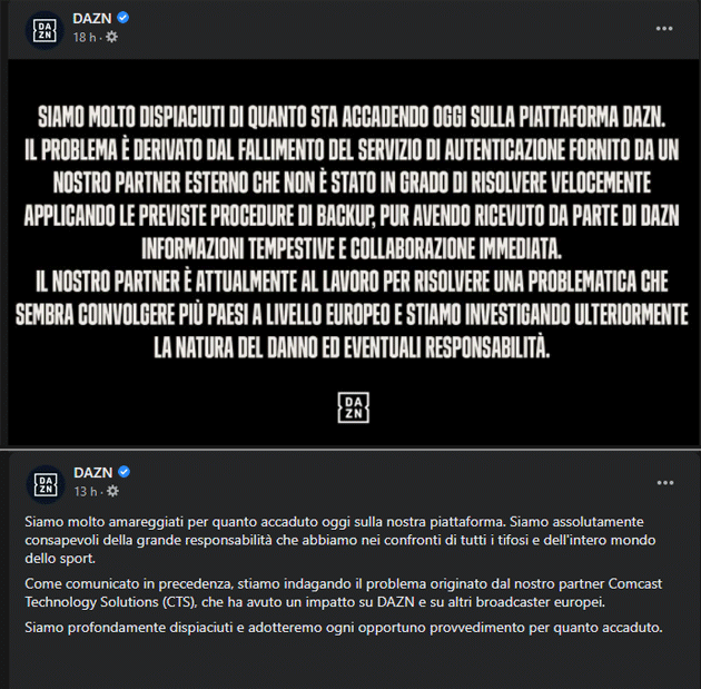 "Siamo molto dispiaciuti di quanto sta accadendo oggi sulla piattaforma DAZN. Il problema è derivato dal fallimento del servizio di autenticazione fornito da un nostro partner esterno che non è stato in grado di risolvere velocemente applicando le previste procedure di backup, pur avendo ricevuto da parte di DAZN informazioni tempestive e collaborazione immediata. Il nostro partner è attualmente al lavoro per risolvere una problematica che sembra coinvolgere più paesi a livello europeo e stiamo investigando ulteriormente la natura del danno ed eventuali responsabilità".