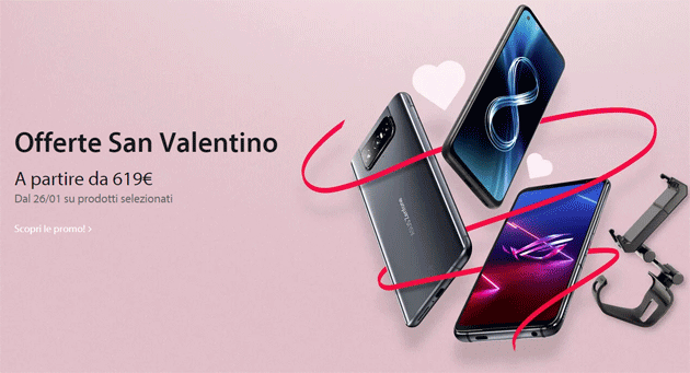 Per la feste degli innamorati, quest’anno Asus nel proprio eStore propone una serie di prodotti a prezzo speciale, tra cui anche smartphone. Ad esempio, Zenfone 8 si può acquistare con prezzi da 619 euro (risparmiando 80 euro), Zenfone 8 Flip si può acquistare con prezzi da 739 euro (risparmiando 60 euro). Tra gli altri prodotti in offerta: Asus 2021 ROG Strix G15 G513IE-HN046W a partire da 1.299 euro (anzichè 1.349 euro), Asus 2021 ROG Zephyrus G14 GA401QC-HZ208T a partire da 1.449 euro (anzichè 1.499 euro), Asus Vivobook S15 M533 a partire da 899 euro (anzichè 999 euro), Asus Vivobook Pro 15 OLED (K3500, 11th Gen Intel) a partire da 1.349 euro (anzichè 1.399 euro), Asus P1511 a partire da 569 euro (anzichè 769 euro), Asus Vivobook 15 OLED K513 (11th gen intel) a partire da 849 euro (anzichè 919 euro), Asus Zen AiO 22 A5200 a partire da 649 euro (anzichè 749 euro).