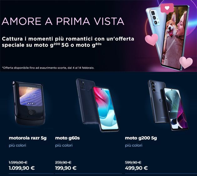 In occasione della festa degli innamorati di quest’anno, Motorola propone nel suo store online (www.motorola.it/valentines) dal 4 al 14 febbraio gli smartphone Moto G60s e Moto G200 5G a prezzo speciale: Moto G60s a 199,90 euro (anzichè 259,90 euro) e Moto G200 5G a 499,90 euro (anzichè 599,90 euro). In promozione segnaliamo anche la disponibilità del Motorola Razr 5G, al prezzo di 1099,90 euro anzichè 1599,90 euro.