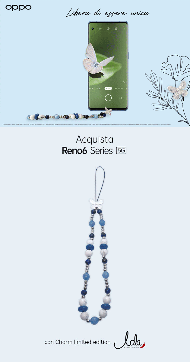 Per gli amanti della tecnologia, in occasione della feste degli innamorati, il brand Oppo quest’anno lancia “Charm Limited Edition Lola” by Chiara Costacurta jewelry, una capsule collection di phone charms – dei ‘braccialetti per smartphone’ – interamente dedicata all’ultimissima serie Reno6. Al centro di ciascuna collezione c’è una farfalla, smaltata a mano, simbolo associato alla bellezza femminile nonchè un inno a non temere i cambiamenti