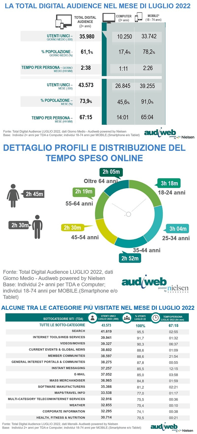 Audiweb, a Luglio 2022 online 43,6 milioni di individui dai 2 anni in su, complessivamente per 67 ore