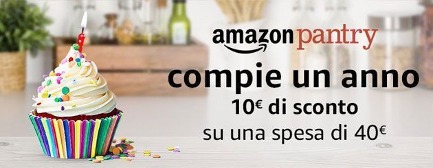 Amazon.it per festeggiare un anno del servizio Amazon Pantry in Italia ha lanciato la promozione "Compleanno Amazon Pantry" attraverso cui regala 10 euro di sconto per una spesa minima di 40 euro su una selezione di prodotti. Questa promozione è valida dal 6 al 12 Novembre 2017.