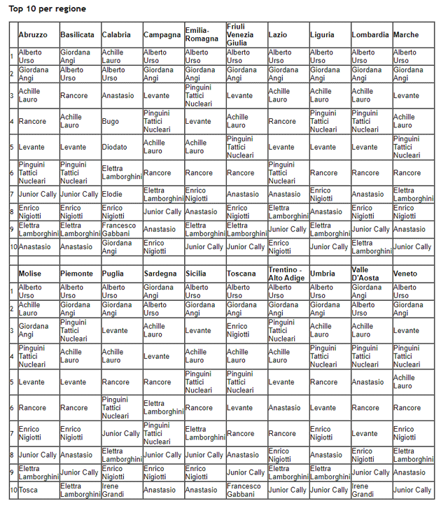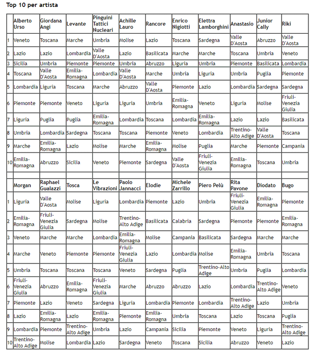 Alberto Urso è l’artista preferito dai clienti in 17 regioni d’Italia eccetto che in Basilicata, Sardegna e Valle d’Aosta, dove in testa si trova Giordana Angi, e della Calabria, dove l’artista preferito è Achille Lauro. Giordana Angi è al secondo posto in tutte le regioni italiane tranne che in Basilicata, Calabria, Sardegna e Valle D’Aosta dove si trova Alberto Urso, mentre in Molise la seconda posizione spetta ad Achille Lauro. Terza posizione per Levante in Campania, Marche, Sardegna, Sicilia e Veneto, Achille Lauro in Abruzzo, Lazio, Liguria, Lombardia, Sardegna, Umbria e Valle d’Aosta. Terzo posto per i Pinguini Tattici Nucleari in Emilia Romagna, Piemonte e Umbria. Giordana Angi si trova in terza posizione in Molise, mentre Anastasio e Rancore hanno la medaglia di bronzo in Calabria e Basilicata, rispettivamente.
