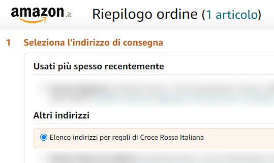 – si seleziona nella pagina di riepilogo dell’ordine come ‘altro indirizzo’ la voce ‘indirizzi per regali di Croce Rossa Italiana’ come indirizzo di spedizione,