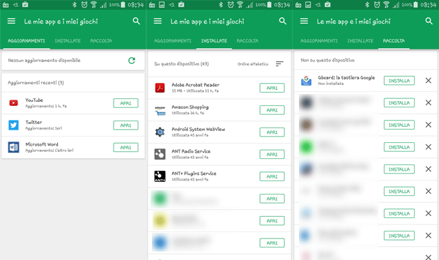 A partire dal 18 aprile, ricapitolando, la sezione ‘Le mie app e i miei giochi’ nel Play Store va a dividersi in tre schede: Aggiornamenti, Installate e Raccolta. Nella scheda Aggiornamenti è possibile trovare gli aggiornamenti disponibili e non ancora installati per le app esistenti, oltre all’elenco delle app che sono state di recente aggiornate; è quindi disponibile il pulsante ‘refresh’ per verificare manualmente la presenza di nuovi aggiornamenti, se non sono gia’ segnalati tra quelli disponibili. Nella scheda Installate si trova l’elenco delle app e dei giochi presenti sul dispositivo con la possibilità di ordinare i titoli installati in base a diversi criteri e premere sul pulsante ‘Apri’ al fianco di ciascun titolo per avviarlo. Nella scheda ‘Raccolta’ si trova l’elenco delle app e dei giochi che sono stati scaricati tramite l’account Google selezionato ma su altri dispositivi (potreste quindi trovare app che avete sul tablet ma non ancora le avete installate sul telefono) con possibilità di installare subito tramite il pulsante ‘Installa’ al fianco di ogni titolo. Da segnalare che, chi si iscrive al programma beta di alcune app per testare funzionalità in anteprima, vedrà una quarta scheda ‘Beta’ con l’elenco delle app di cui è tester.