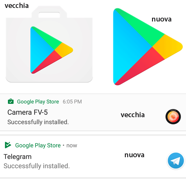 L’icona che identifica il Play Store cambia anche nelle notifiche, e generalmente si puo’ dire che il ‘sacchetto’ identificativo è stato completamente sostituito da una nuova icona a triangolo. La spunta bianca che prima era completamente dentro la borsa di colore verde ora è per metà verde e metà bianca, a seconda se si trova dentro o fuori il triangolino verde che identifica il Play Store.