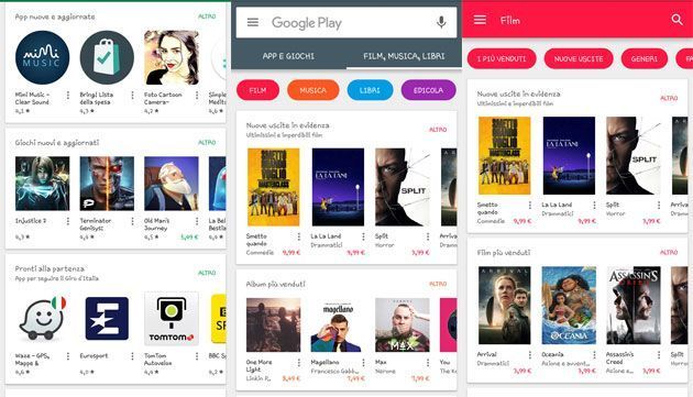 Nelle immagini qui sotto potete vedere come cambia l’icona del Play Store su Android e come appaiono ora i contenuti raggruppati per sezione.