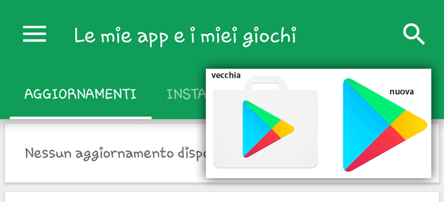 LA NUOVA ICONA. La nuova icona dell’app Google Play cambia quasi completamente, con il triangolo colorato al centro che esce dalla ‘borsa della spesa’ di colore bianco in cui si trovava prima mostrandosi cosi’ piu’ in grande. L’altezza della nuova icona è sostanzialmente la stessa di quella vecchia, solo che essendo il triangolo non piu’ circondato da nulla appare piu’ grande di prima.