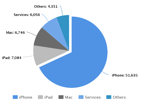 Apple è una società che deve la maggior parte dei propri ricavi alle vendite di iPhone e iPad, anche se di recente ha iniziato a diversificare il proprio portfolio di prodotti prima lanciando il nuovo Apple Watch (entrando di fatto nel mercato dei dispositivi indossabili), poi aggiornando il set-top-box Apple TV, poi lanciando il servizio di streaming musicale Apple Music per competere contro TIDAL e Spotify e altri servizi simili, e poi ancora con l’investimento in nuovi mercati, come potrebbe essere quello delle auto (secondo le indiscrezioni). Resta comunque il fatto che Apple guadagna grazie alla vendita di iPhone, perchè sono le vendite di melafoini che rappresentano oltre il 50% delle entrate di Apple ormai da parecchi trimestri.