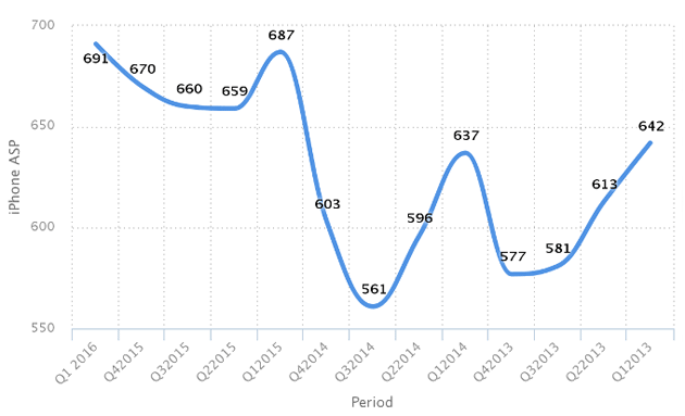 Il prezzo medio di vendita di un iPhone ha raggiunto il suo massimo storico nel 1 trimestre fiscale 2016 di Apple: 691 dollari per melafonino. Nel terzo trimestre 2014 un iPhone costava mediamente 561 dollari.