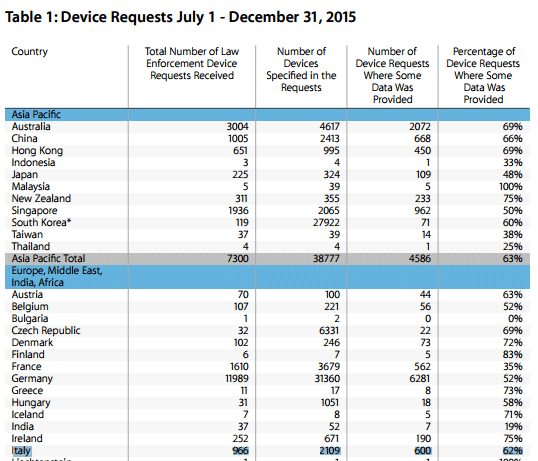 le autorità italiane hanno chiesto a Apple informazioni per 31 account utente, con la società di Cupertino che ha detto di aver consegnato informazioni su 8 account del totale di richieste. Riguardo le richieste di informazioni sui dispositivi smarriti o rubati, Apple ha ricevuto dall'Italia 966 richieste relative a 2.019 dispositivi, soddisfandone il 62 per cento.