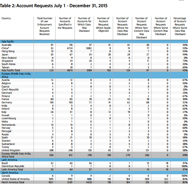 Solo nel periodo compreso tra luglio e dicembre 2015, il governo statunitense ha chiesto a Apple di fornire informazioni su 5.192 account individuali, di cui Apple ha consegnato i dati di 4.411 profili. Apple ha divulgato i dati "non-content" come ad esempio i dati di log e il nome e l’indirizzo di posta elettronica per 509 conti, mentre "alcuni" contenuti (non specificati) sono stati consegnati per 322 account. La società ha inoltre fornito informazioni per il 82 per cento di tutte le richieste di account statunitensi, opponendosi a 116 casi specifici.