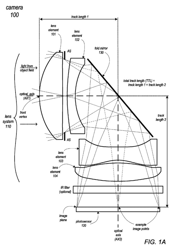 Appartenente ad Apple è stato reso pubblico un nuovo brevetto, dal titolo piuttosto esplicativo "folded telephoto camera lens system" che descrive un metodo per realizzare un modulo fotocamera con una sorta di forma a "r", che ricorda quella di un periscopio, in grado di incanalare la luce attraverso la lente primaria, quindi la fa rimbalzare in uno specchio, e viene reindirizzata verso una lente secondaria che si trova sul sensore di immagine.