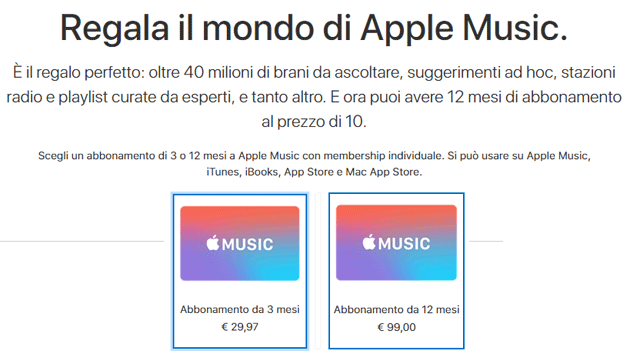 Apple Music potrebbe attirare ancora piu’ amanti della musica in streaming di fascia media in quanto la società di Cupertino ha iniziato a rendere disponibile la carta regalo del valore di 99 euro che consente, a chi le attiva, di abbonarsi per 12 mesi (1 anno) ad Apple Music.